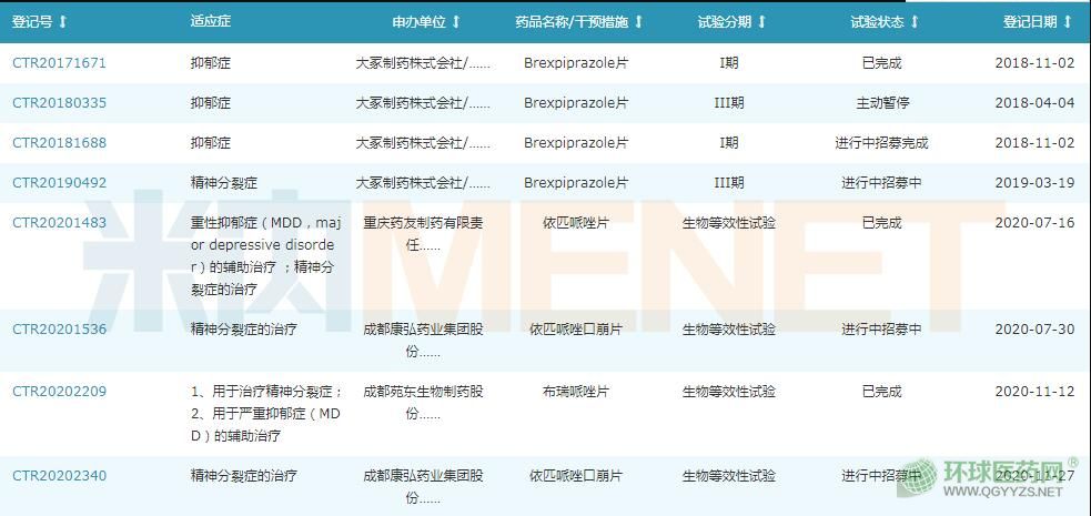 目前布瑞哌唑原研藥尚未在國內(nèi)獲批,大冢制藥該品種在國內(nèi)處于III期臨床試驗(yàn)階段。此外,康弘藥業(yè)的2.2類改良型新藥依匹哌唑口崩片正在進(jìn)行BE試驗(yàn)。2021年3月16日,重慶藥友的布瑞哌唑片仿制3類上市申請獲得承辦,苑東生物為該產(chǎn)品第2家報(bào)產(chǎn)企業(yè),首仿爭奪戰(zhàn)已經(jīng)打響。
