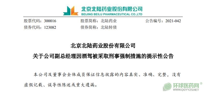 5月31日,北京北陸藥業(yè)股份有限公司發(fā)布了關(guān)于公司副總經(jīng)理因酒駕被采取刑事強(qiáng)制措施的提示性公告。