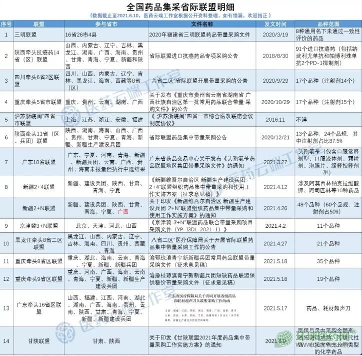 目前藥品集采省際聯(lián)盟達(dá)到14個(gè)。包括三明聯(lián)盟、陜西牽頭11省聯(lián)盟、陜西牽頭抗癌藥14省(區(qū))聯(lián)盟、重慶牽頭5省聯(lián)盟、四川牽頭六省二區(qū)聯(lián)盟、“滬蘇浙皖閩”四省一市聯(lián)盟、廣東牽頭10省聯(lián)盟、京津冀“3%20N”聯(lián)盟、新疆“2%20N”聯(lián)盟、黑龍江牽頭八省二區(qū)聯(lián)盟、重慶牽頭8省區(qū)常用藥聯(lián)盟、重慶牽頭9省區(qū)短缺藥聯(lián)盟、廣東牽頭16省區(qū)聯(lián)盟、甘陜聯(lián)盟。此外,長(zhǎng)三角聯(lián)盟也在醞釀中。