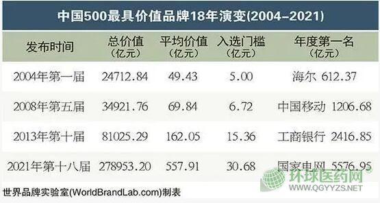 世界品牌實(shí)驗(yàn)室編制中國品牌報告已是第18個年頭,2004年入選門檻僅為5億元,前500名品牌的平均價值為49.43億元。18年以后的2021年,入選門檻已經(jīng)提高到30.68億元,而前500名品牌的平均價值高達(dá)557.91億元,增加幅度為1028.69%。