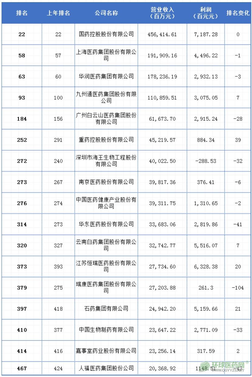 2020年《財富》中國500強醫(yī)藥企業(yè)排名名單