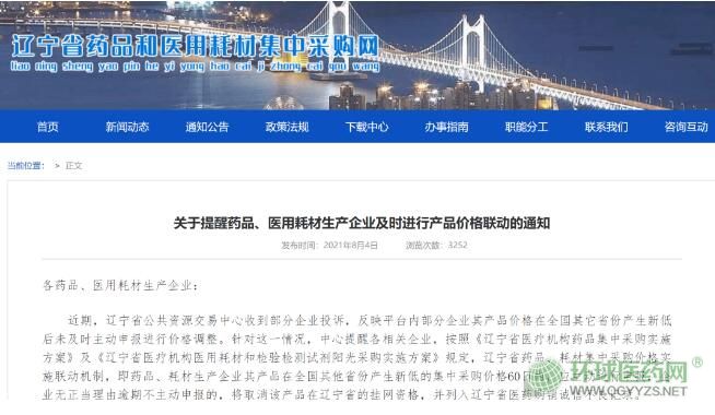 8月4日,遼寧省公共資源交易中心官網(wǎng)發(fā)布公告稱,該平臺收到部分企業(yè)投訴,反映平臺內(nèi)部分企業(yè)其產(chǎn)品價格在全國其它省份產(chǎn)生新低后未及時主動申報進行價格調(diào)整。對此,該中心依照相關(guān)規(guī)定通知部分企業(yè),藥品生產(chǎn)企業(yè)其產(chǎn)品在全國其他省份產(chǎn)生新低的集中采購價格60日內(nèi),應(yīng)主動進行申報,企業(yè)無正當(dāng)理由逾期不主動申報的,將取消該產(chǎn)品在遼寧省的掛網(wǎng)資格,并列入遼寧省醫(yī)藥購銷誠信不良記錄。