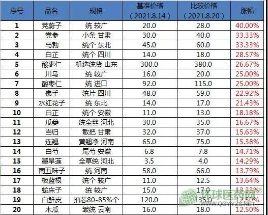 表1:市場漲價品種TOP20