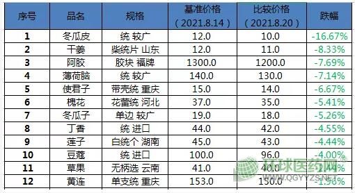 冬瓜皮,隨著產(chǎn)新深入,受貨源的陸續(xù)上市沖擊,價格疲軟下行,貨源一般為小批量購銷,市場藥廠貨多要價在9-10元,顏色好的貨報價在12-15元之間不等。