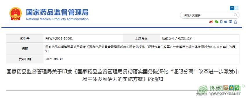 8月30日,國家藥品監(jiān)督管理局官網(wǎng)消息,為貫徹落實《國務(wù)院關(guān)于深化“證照分離”改革進(jìn)一步激發(fā)市場主體發(fā)展活力的通知》(國發(fā)〔2021〕7號,以下簡稱《通知》)要求,全面扎實推進(jìn)藥品監(jiān)管領(lǐng)域“證照分離”改革各項工作,制定《國家藥品監(jiān)督管理局貫徹落實國務(wù)院深化“證照分離”改革進(jìn)一步激發(fā)市場主體發(fā)展活力的實施方案》。