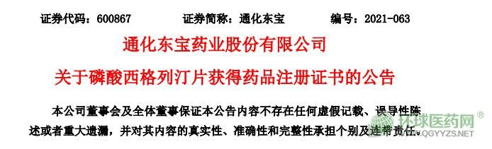 9月7日,通化東寶藥業(yè)股份有限公司(以下簡(jiǎn)稱“公司”)宣布收到國(guó)家藥品監(jiān)督管理局核準(zhǔn)簽發(fā)的磷酸西格列汀片《藥品注冊(cè)證書(shū)》。