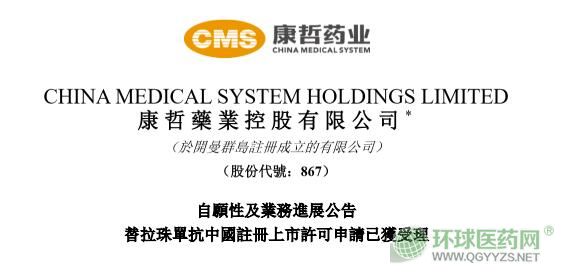 10月14日,康哲藥業(yè)(00867.HK)宣布,集團(tuán)創(chuàng)新產(chǎn)品替拉珠單抗注射液(”產(chǎn)品“)注冊(cè)上市許可申請(qǐng)已于2021年10月14日獲得中華人民共和國(guó)國(guó)家藥品監(jiān)督管理局受理。
