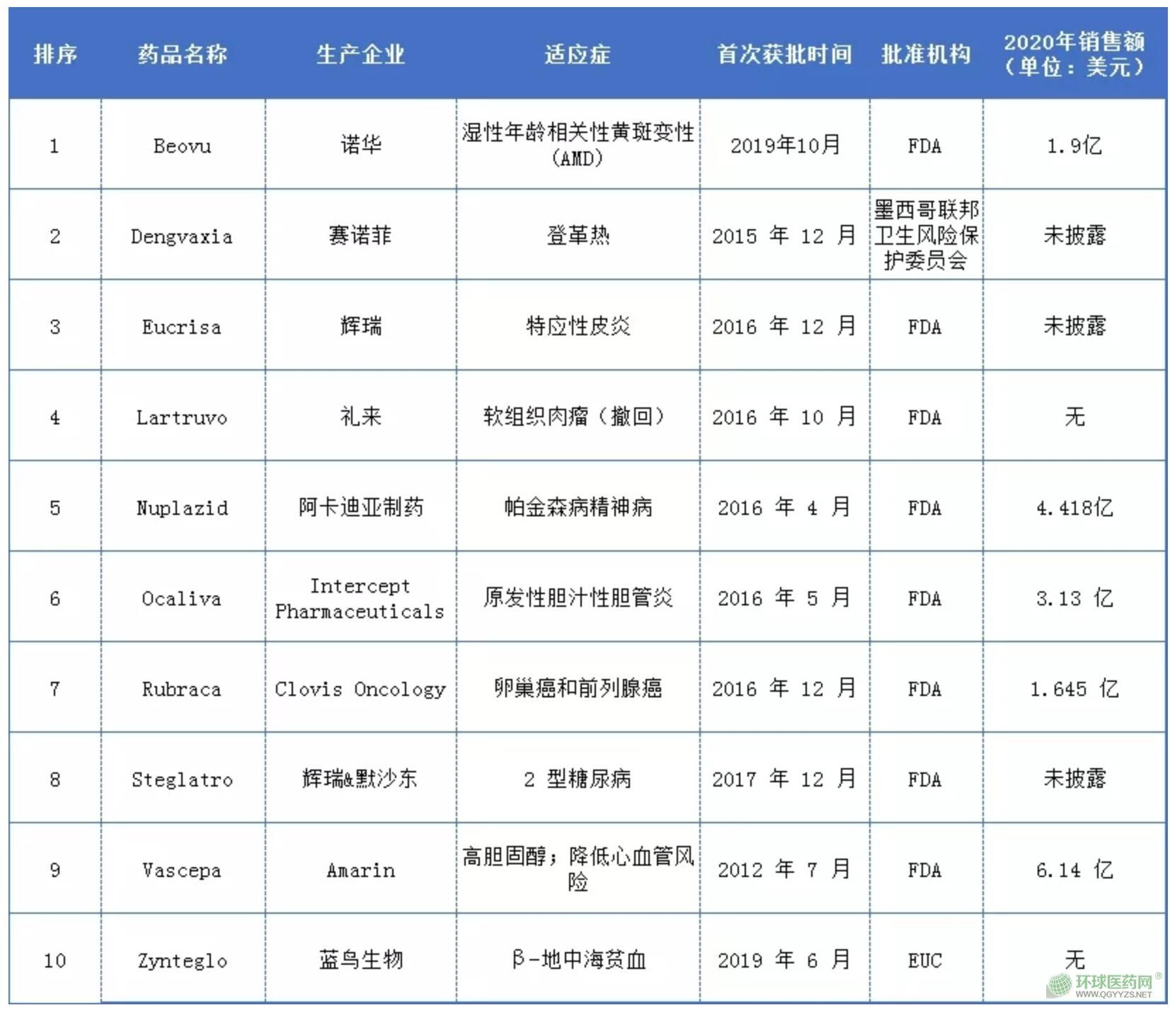 TOP10藥品覆蓋腫瘤、免疫學(xué)、傳染病、眼科、血液疾病、腦部疾病以及心血管和代謝疾病等多個(gè)領(lǐng)域。涉及輝瑞、諾華、禮來(lái)等這種制藥巨頭,也有Amarin、藍(lán)鳥(niǎo)生物等這樣的生物技術(shù)初創(chuàng)型公司。