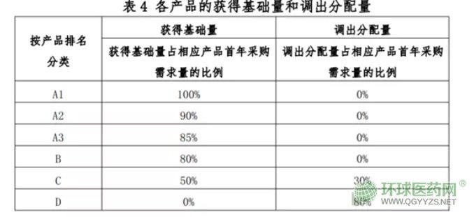 第一步是獲得基礎量,該量為同采購組內,各產(chǎn)品根據(jù)排名和分類分別按其首年采購需求量的一定比例,確定獲得基礎量以及調出分配量。