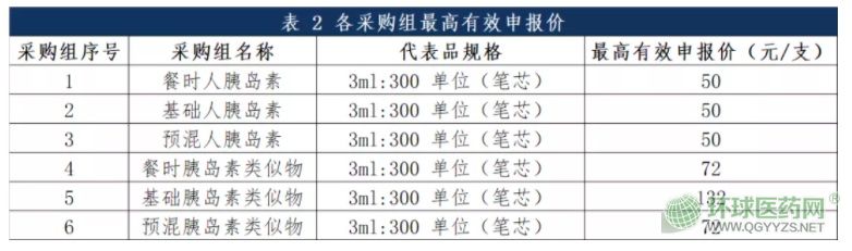本次藥品集中采購品種的采購組分為:餐時人胰島素、基礎人胰島素、預混人胰島素、餐時胰島素類似物、基礎胰島素類似物、預混胰島素類似物等6個采購組,本次胰島素集中采購各采購組報價單元以3ml:300單位(筆芯)規(guī)格為代表品,最高有效申報價見下圖。