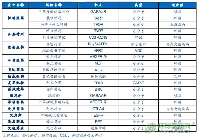 據安信證券報告統(tǒng)計,19款創(chuàng)新藥從藥物靶點而言,涵蓋了PARP抑制劑、BTK抑制劑、ALK抑制劑、ADC藥物、CAR-T療法等熱門靶點創(chuàng)新產品在內。