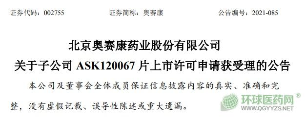 11月16日,奧賽康發(fā)布公告,其全資子公司江蘇奧賽康藥業(yè)有限公司于近日收到國(guó)家藥品監(jiān)督管理局下發(fā)的 ASK120067 片境內(nèi)生產(chǎn)藥品注冊(cè)上市許可申請(qǐng)《受理通知書》。