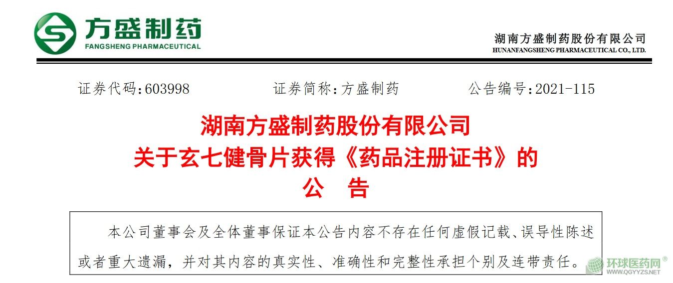 12月7日,方盛制藥發(fā)布公告稱,于近日收到國家藥監(jiān)局核準簽發(fā)的《藥品注冊證書》,公司研發(fā)的玄七健骨片已獲得藥品批準文號,并可進行生產(chǎn)。用于輕中度膝骨關(guān)節(jié)炎中醫(yī)辨證屬筋脈瘀滯證的癥狀改善,癥見膝關(guān)節(jié)局部疼痛,活動不利,局部腫脹、壓痛、痛有定處、僵硬、活動受限,舌質(zhì)暗紅或有瘀斑,苔薄或薄白,脈滑或弦。