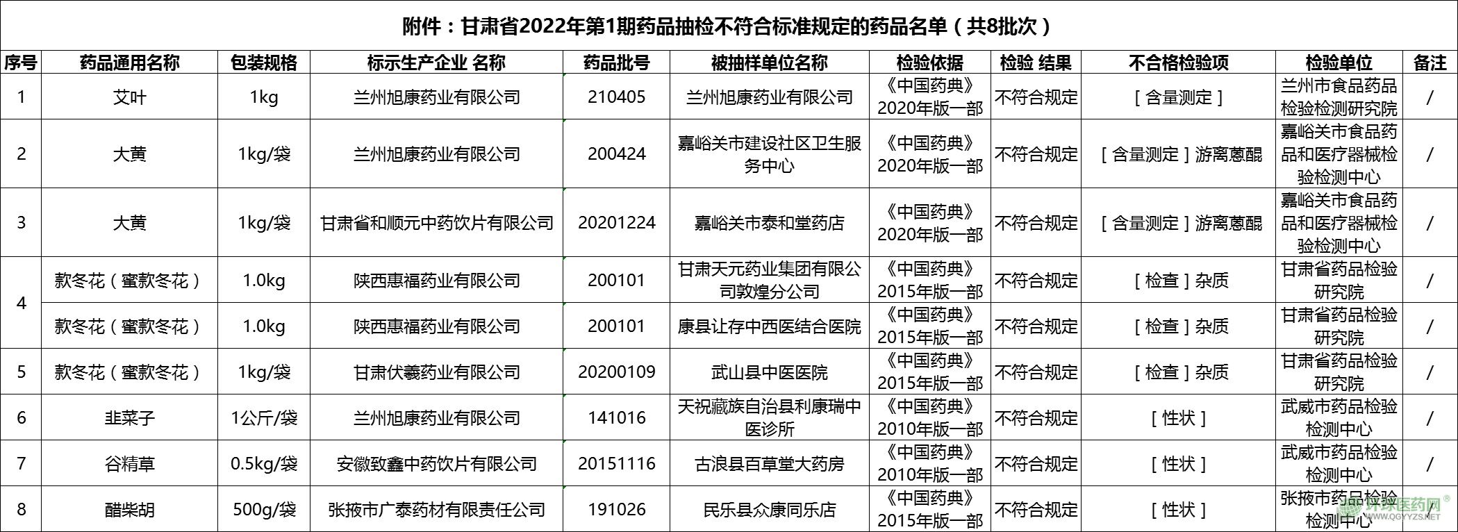 附件:甘肅省2022年第1期藥品抽檢不符合標(biāo)準(zhǔn)規(guī)定的藥品名單(共8批次)