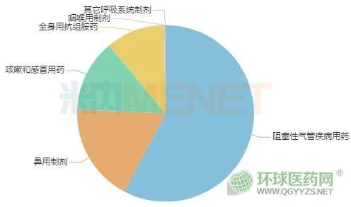 從亞類格局來看,前五大亞類的銷售額均大幅增長(zhǎng),其中,阻塞性氣管疾病用藥市場(chǎng)份額最大,超過50%,鼻用制劑和咳嗽和感冒用藥分別排第二、三位。