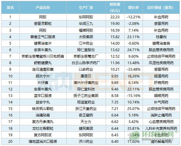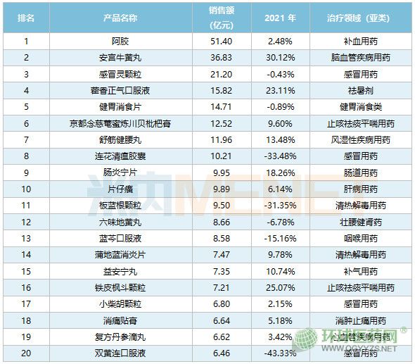 中成藥品牌TOP20中,9個品牌的銷售額超過10億元;補血用藥占3席,腦血管疾病用藥、感冒用藥、止咳祛痰平喘用藥均占兩席;華潤醫(yī)藥集團旗下共有4個品牌上榜,分別為阿膠、感冒靈顆粒、健胃消食片及復方阿膠漿。