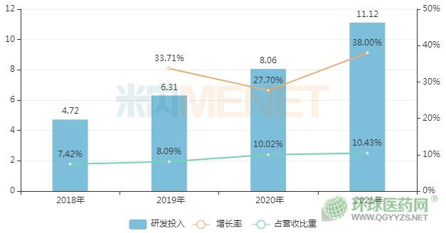 為抵消集采帶來的影響,樂普醫(yī)療近年來逐漸加大研發(fā)力度,希冀通過原創(chuàng)產(chǎn)品實(shí)現(xiàn)突圍。2021年公司研發(fā)投入首次突破10億元,達(dá)11.12億元,同比增長(zhǎng)38%,研發(fā)投入占營業(yè)收入比重由2018年的7.42%提升至2021年的10.43%。