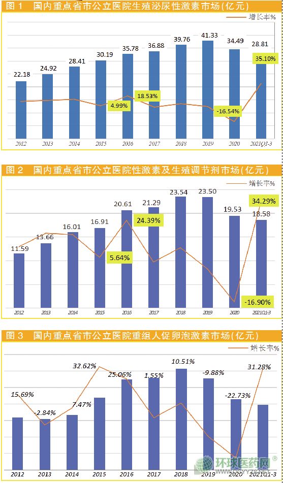 2021年1-3季度國內(nèi)重點省市公立醫(yī)院性激素及生殖系統(tǒng)調(diào)節(jié)劑TOP10藥物——重組人促卵泡激素注射液、黃體酮、地屈孕酮片、注射用尿促卵泡激素、重組促卵泡素β注射液、屈螺酮炔雌醇片、尿促性素注射用藥、雌二醇/雌二醇地屈孕酮片、雌二醇、重組人促黃體激素α平均增長率超過35%。