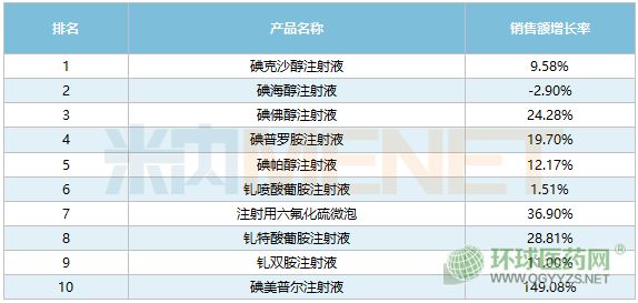 除了位列第二的碘海醇注射液,其余9個(gè)產(chǎn)品銷售額均實(shí)現(xiàn)正增長(zhǎng)。7個(gè)產(chǎn)品增速在10%以上,碘美普爾注射液增速高達(dá)149.08%,注射用六氟化硫微泡增速為36.90%,釓特酸葡胺注射液、碘佛醇注射液增速分別為28.81%、24.28%。