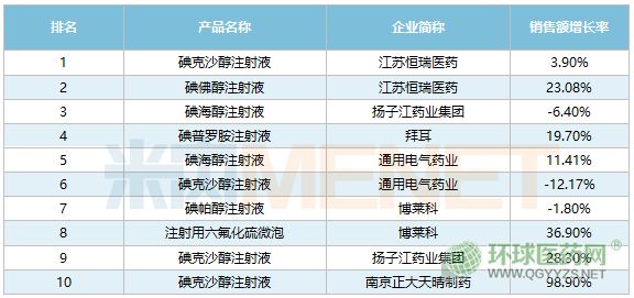 造影劑品牌TOP10中,恒瑞醫(yī)藥的碘克沙醇注射液、碘佛醇注射液位居前二席,揚(yáng)子江藥業(yè)的碘海醇注射液位列第三;恒瑞醫(yī)藥、揚(yáng)子江藥業(yè)、通用電氣藥業(yè)、博萊科等4家企業(yè)均有2個(gè)品牌上榜;南京正大天晴的碘克沙醇注射液憑借98.90%的銷售增速,首次躋身TOP10。