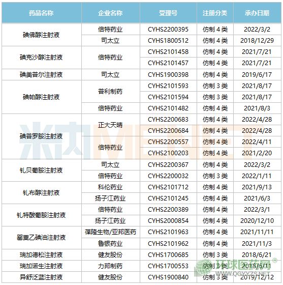 米內(nèi)網(wǎng)數(shù)據(jù)顯示,目前12款造影劑(23個(gè)品規(guī))的仿制3/4類上市申請(qǐng)?jiān)趯徶校@批生產(chǎn)后將視同通過(guò)一致性評(píng)價(jià)。其中,倍特藥業(yè)涉及6個(gè)品種,司太立涉及3個(gè)品種,揚(yáng)子江藥業(yè)、健友股份各有2個(gè)品種。