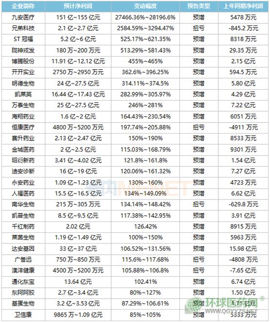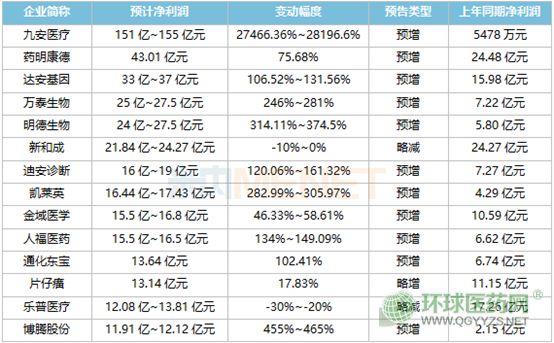 2022年上半年預(yù)計凈利潤增幅超100%的A股醫(yī)藥企業(yè)