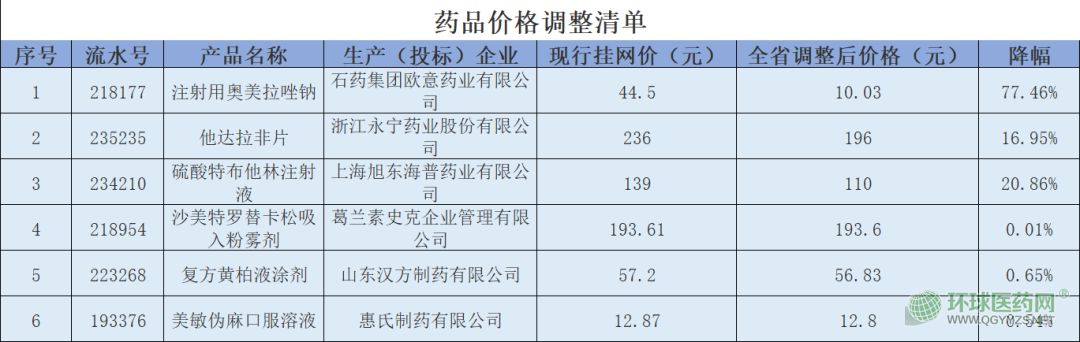 此次降價(jià)的產(chǎn)品共六個(gè),分別是注射用奧美拉唑鈉、他達(dá)拉非片、硫酸特布他林注射液、沙美特羅替卡松吸入粉霧劑、復(fù)方黃柏液涂劑、美敏偽麻口服溶液。其中石藥歐意的注射液奧美拉唑鈉降幅最大,從原來的44.5元下降到10.03元,降幅達(dá)77.4%。