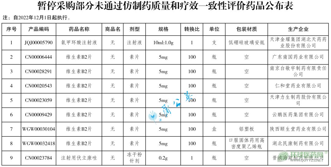 2022年11月24日,江蘇省公共資源中心發(fā)布了未通過一致性評(píng)價(jià)的仿制藥暫停采購?fù)ㄖ,涉?個(gè)品種氨甲環(huán)酸注射液、維生素B2片和注射用伏立康唑,共計(jì)9個(gè)文號(hào)、12月1日開始執(zhí)行。
