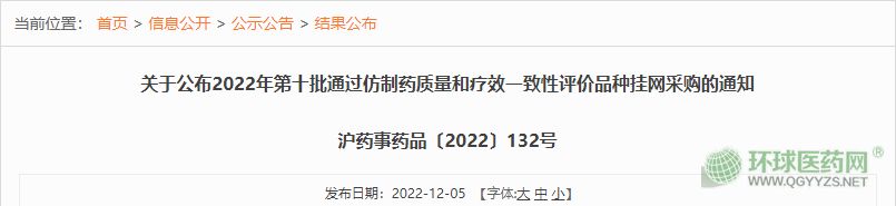 2022年12月5日藥品信息將通過“上海市醫(yī)藥采購服務(wù)與監(jiān)管信息系統(tǒng)”(以下簡稱陽光平臺)向醫(yī)療機(jī)構(gòu)推送,2022年12月7日生效議價(jià)。