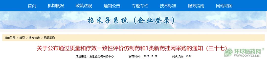 2022年12月29日,浙江省藥械平臺發(fā)布了《關(guān)于公布通過質(zhì)量和療效一致性評價(jià)仿制藥和1類新藥掛網(wǎng)采購的通知》涉及通過一致性評價(jià)仿制藥119個、擬優(yōu)先掛網(wǎng)品種20個、新藥3個,自2022年12月30日開始納入掛網(wǎng)目錄。
