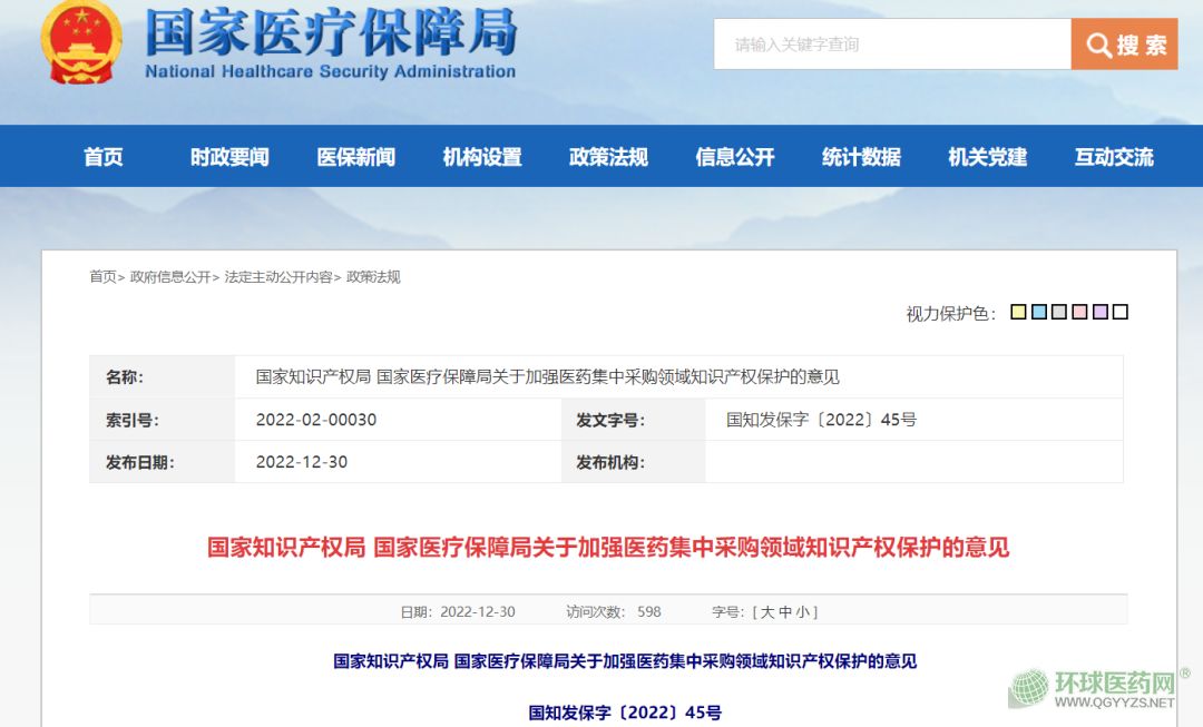 2022年12月30日,據(jù)國家醫(yī)療保障局網(wǎng)站消息,國家知識(shí)產(chǎn)權(quán)局、國家醫(yī)療保障局發(fā)布關(guān)于加強(qiáng)醫(yī)藥集中采購領(lǐng)域知識(shí)產(chǎn)權(quán)保護(hù)的意見,其中提出,國家知識(shí)產(chǎn)權(quán)局和國家醫(yī)療保障局建立醫(yī)藥領(lǐng)域知識(shí)產(chǎn)權(quán)保護(hù)協(xié)調(diào)會(huì)商機(jī)制。
