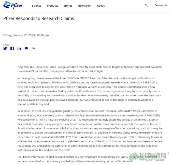 當(dāng)?shù)貢r間27日,輝瑞在官網(wǎng)緊急發(fā)聲,希望澄清事實(shí)。輝瑞的聲明中稱,最近有指控稱輝瑞公司進(jìn)行功能獲得和定向進(jìn)化研究,該公司希望澄清事實(shí)。