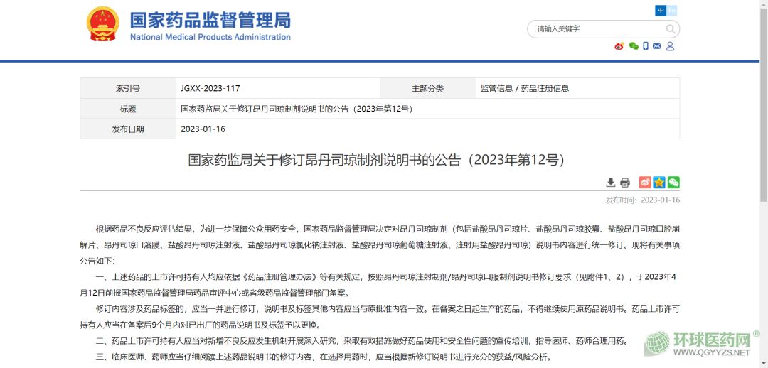2023年1月16日,國(guó)家藥監(jiān)局發(fā)布三條公告,要求鹽酸賴氨酸注射劑、卡絡(luò)磺鈉制劑、昂丹司瓊制劑等藥品修訂說(shuō)明書。