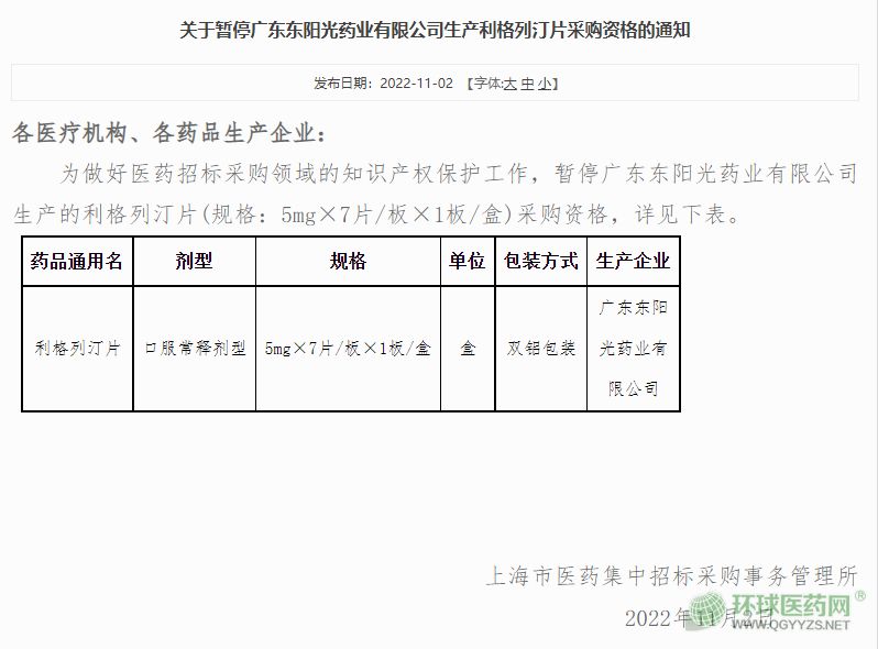 除了上海,其他省也有類似公告,比如,去年 11 月 2 日,上海市醫(yī)藥集中招標(biāo)采購事務(wù)管理所發(fā)布暫停采購公告,為做好醫(yī)藥招標(biāo)采購領(lǐng)域的知識產(chǎn)權(quán)保護工作,暫停廣東東陽光藥業(yè)有限公司生產(chǎn)的利格列汀片(規(guī)格:5mg×7片/板×1板/盒)采購資格。