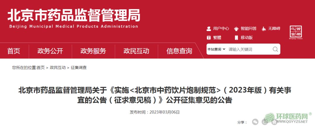 3月6日,北京市藥品監(jiān)督管理局發(fā)布《實施<北京市中藥飲片炮制規(guī)范>(2023年版)有關(guān)事宜的公告(征求意見稿)》,向社會公開征求意見。公開征集意見時間為:2023年3月6日至4月6日。