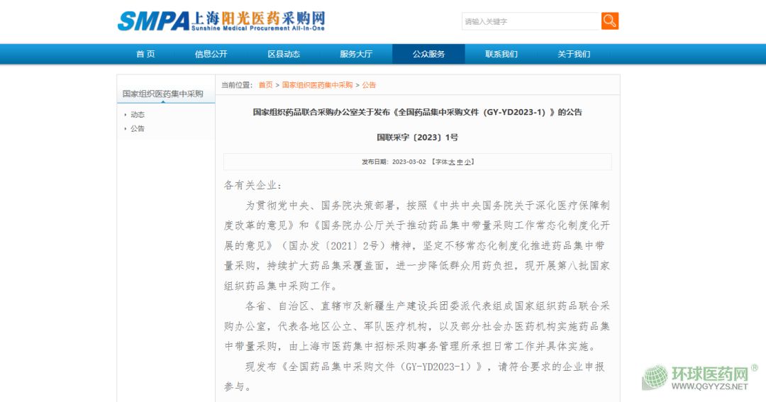 3月2日,上海陽(yáng)光醫(yī)藥采購(gòu)網(wǎng)發(fā)布《全國(guó)藥品集中采購(gòu)文件(GY-YD2023-1)》。