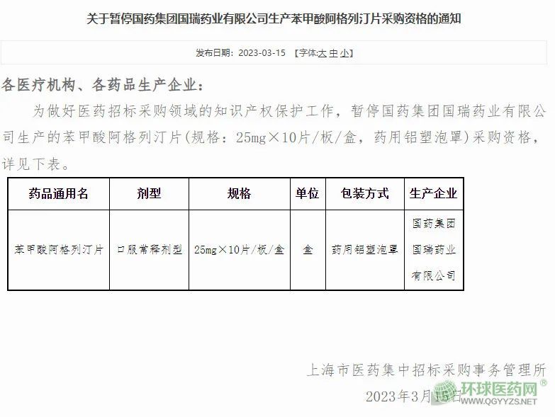 今日,上海市醫(yī)藥集中招標(biāo)采購事務(wù)管理所發(fā)布通知,為做好醫(yī)藥招標(biāo)采購領(lǐng)域的知識產(chǎn)權(quán)保護(hù)工作,暫停國藥集團(tuán)國瑞藥業(yè)有限公司生產(chǎn)的苯甲酸阿格列汀片(規(guī)格:25mg×10片/板/盒,藥用鋁塑泡罩)采購資格。