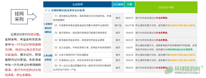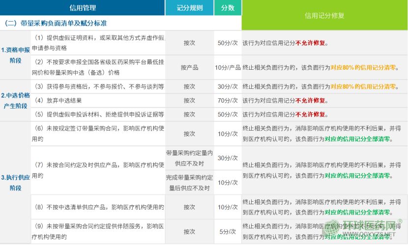 信用記分實(shí)行動(dòng)態(tài)調(diào)整。掛網(wǎng)采購、帶量采購負(fù)面清單中每一行為記分管理周期為3年,自記分公布之日為記分起始日,按次記分,管理周期內(nèi)記分累加。負(fù)面清單中每一行為3年記分管理周期期滿,該行為對(duì)應(yīng)的記分自動(dòng)清零,但信息保留。