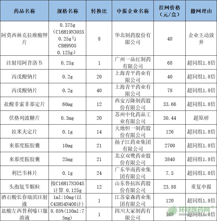 關于撤網的理由,華北制藥的阿莫西林克拉維酸鉀片是企業(yè)主動放棄;注射用更昔洛韋、丙戊酸鈉片鹽酸非索非那定片、拉米夫定片等10個品種是價格超過同組1.8倍;蘇州中化的伏格列波糖片是價格超過原研;魯抗的頭孢氨芐顆粒則是重復申報。
