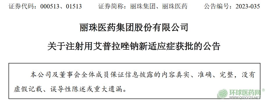 5月8日,麗珠集團(tuán)(000513)發(fā)布公告稱(chēng),近日,麗珠醫(yī)藥集團(tuán)股份有限公司全資子公司麗珠集團(tuán)麗珠制藥廠(chǎng)收到國(guó)家藥品監(jiān)督管理局核準(zhǔn)簽發(fā)的《藥品注冊(cè)證書(shū)》(證書(shū)編號(hào):2023S00625),公司「注射用艾普拉唑鈉」新適應(yīng)癥“預(yù)防重癥患者應(yīng)激性潰瘍出血”獲得注冊(cè)批準(zhǔn)。