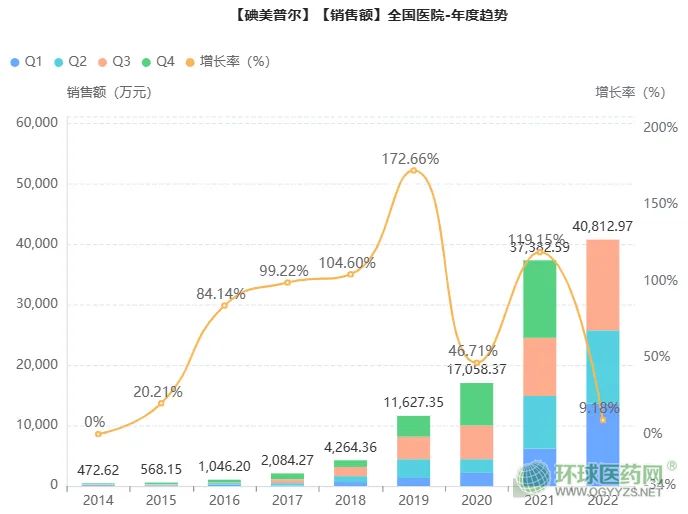此外,據(jù)藥融云統(tǒng)計,2022年前三季度碘美普爾注射液的院內銷售額已超2021年總額,突破4億元,同比增長66%。