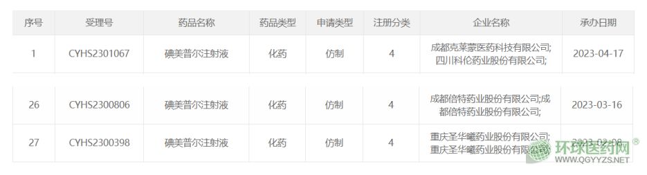 除此之外,根據(jù)國家藥品監(jiān)督管理局藥品評審中心(NMPA),目前國內還有重慶圣華曦藥業(yè)、成都倍特藥業(yè)、成都克萊蒙醫(yī)藥|四川科倫藥業(yè)3家企業(yè)以仿制4類提交碘美普爾注射液上市申請,尚在審評審批中,國產(chǎn)第2家或就在此之中決出。