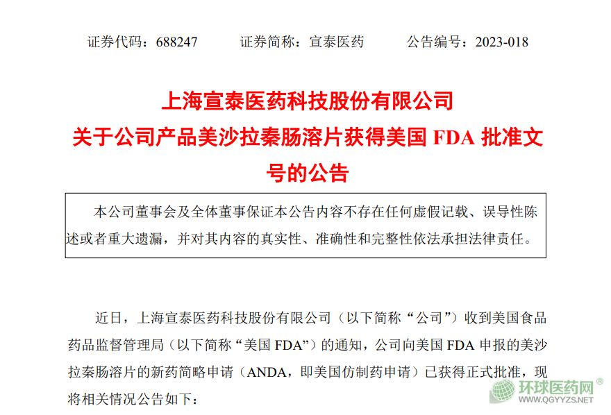 5月16日,上海宣泰醫(yī)藥科技發(fā)布公告,美沙拉秦腸溶片的新藥簡(jiǎn)略申請(qǐng)(ANDA,即美國(guó)仿制藥申請(qǐng))已獲美國(guó)食品藥品監(jiān)督管理局(FDA)正式批準(zhǔn),大有希望成為國(guó)內(nèi)首家過(guò)評(píng)。