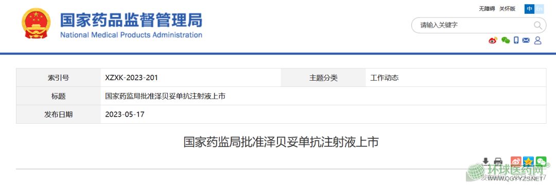 2.浙江博銳生物制藥申報(bào)的澤貝妥單抗注射液(商品名:安瑞昔)獲批上市。
