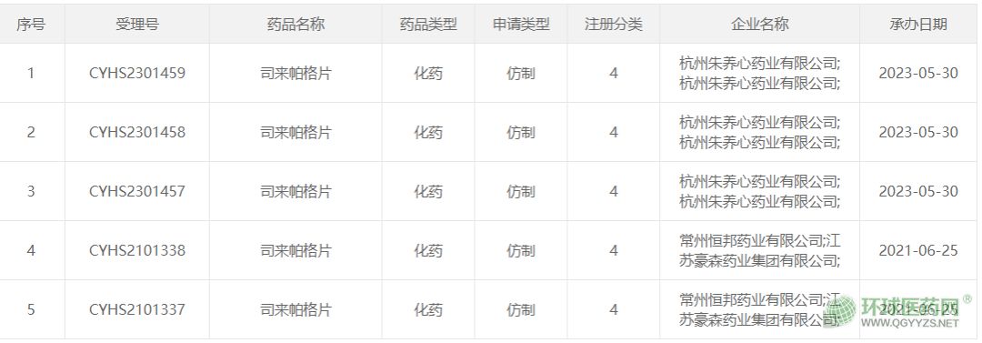 5月30日,CDE官網(wǎng)顯示,杭州朱養(yǎng)心藥業(yè)以仿制4類提交的司來帕格片上市申請(qǐng)獲得CDE承辦受理。目前國內(nèi)已經(jīng)有兩家企業(yè)報(bào)產(chǎn)司來帕格片。