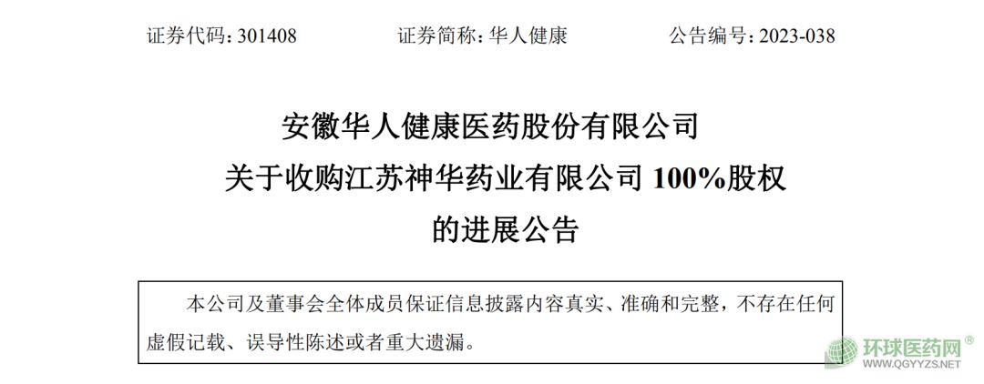 華人健康公告,擬收購江蘇神華藥業(yè)有限公司100%股權(quán),收購價格3.47億元。