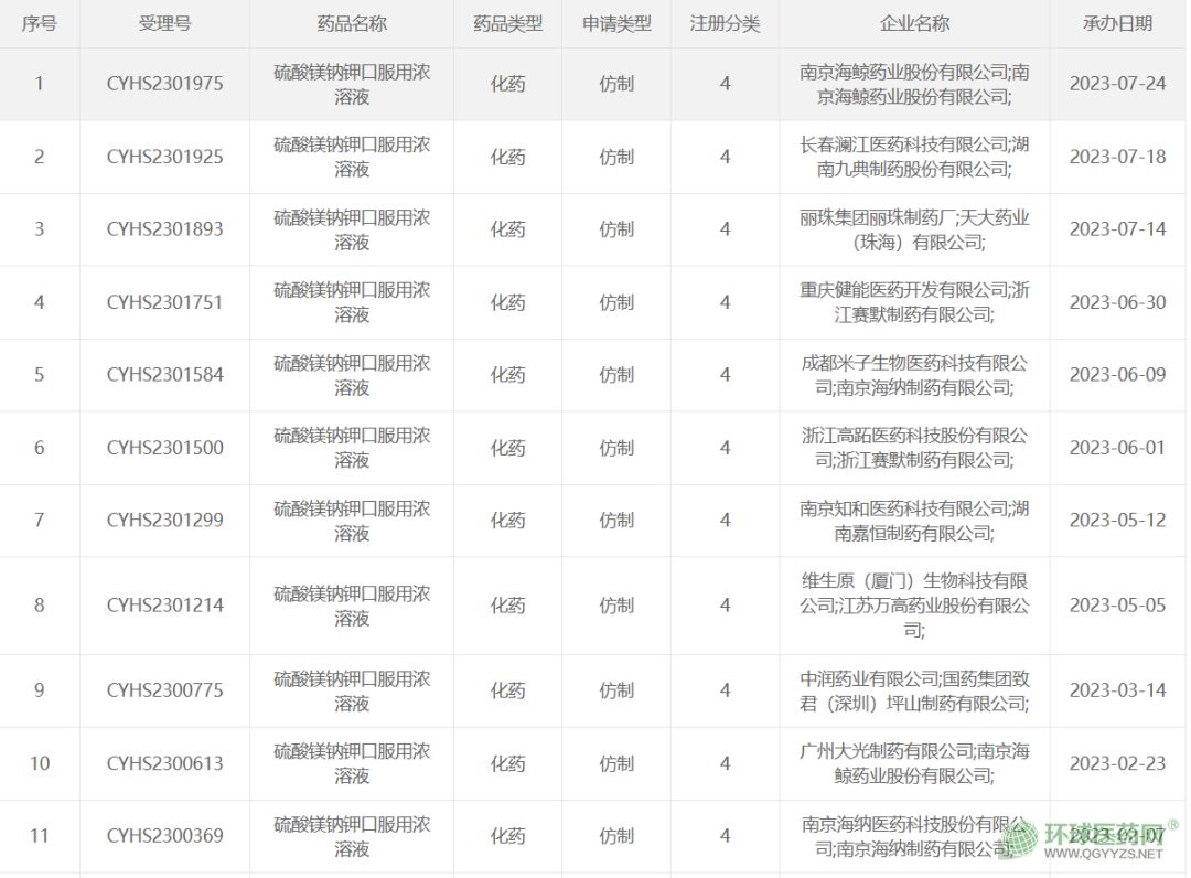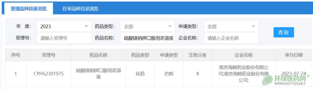 7月24日,國家藥品監(jiān)督管理局官網(wǎng)顯示,南京海鯨藥業(yè)以仿制4類提交的硫酸鎂鈉鉀口服用濃溶液上市申請獲得CDE承辦受理。目前,國內(nèi)有兩家企業(yè)獲批生產(chǎn)硫酸鎂鈉鉀口服用濃溶液仿制藥。