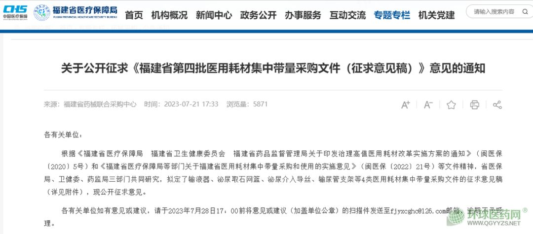 近日,福建省藥械聯(lián)合采購中心發(fā)布《福建省第四批醫(yī)用耗材集中帶量采購文件(征求意見稿)》,將對輸液器、泌尿取石網(wǎng)籃、泌尿介入導絲、輸尿管支架等4類醫(yī)用耗材進行集中帶量采購,周期為一年。