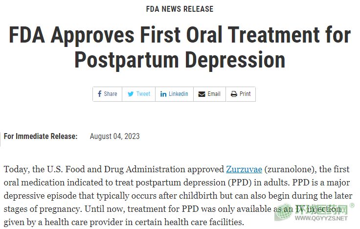 美東時(shí)間8月4日,美國食品藥品監(jiān)督管理局(FDA)批準(zhǔn)了Biogen和Sage Therapeutics公司生產(chǎn)的首個(gè)用于治療產(chǎn)后抑郁癥(PPD)的口服藥祖拉諾酮(Zuranolone),這意味著該藥物將在不久后上市銷售。