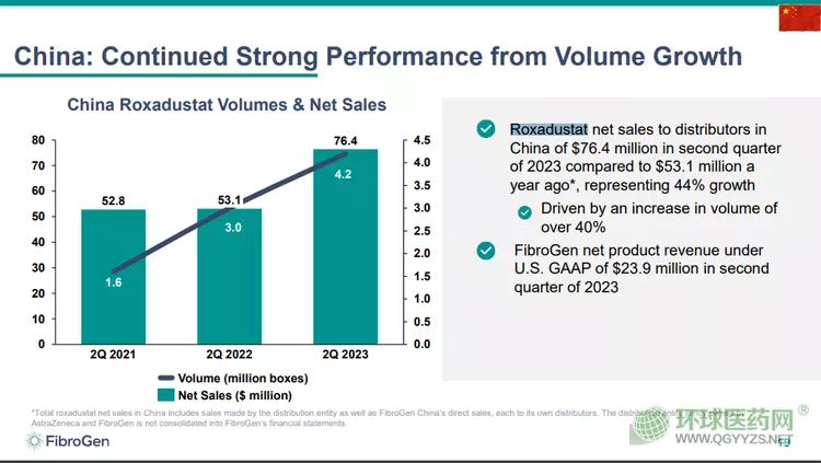 近日,琺博進公布了2023年第二季度財報。數(shù)據(jù)顯示,2023年第二季度羅沙司他膠囊在中國銷售額為7640萬美元,合5.32億元人民幣(按2023年平均匯率1美元=6.959人民幣換算),同比增長44%。